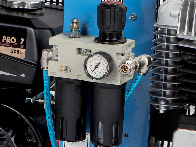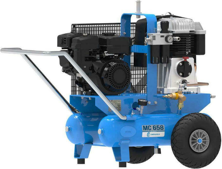 Ο τροχήλατος αεροσυμπιεστής MC658 προσφέρεται με τον κινητήρα βενζίνης EHR210 της Campagnola και έχει την καλύτερη απόδοση σε σχέση με τις διαστάσεις του. Η ισχυρή κεφαλή του υποστηρίζει την ταυτόχρονη λειτουργία πολλαπλών εργαλείων. Επίσης αποδίδει εξαιρετικά στη χρήση αλυσοπρίονου. Μαντεμένιες κεφαλές Ιταλίας, βαρέως τύπου που αποδίδουν πραγματικά αυτό που υπόσχονται! ροφυλάκια Ιταλίας με πιστοποιητικό CE 2014/29/EU, απαραίτητο για την πώληση του μηχανήματος αλλά κυρίως για την ασφάλεια σας. Ανεπίστροφη βαλβίδα Ιταλίας με έμβολο μείωσης στροφών για απροβλημάτιστη λειτουργία (Πιλότος). 2 μανόμετρα γλυκερίνης Φ40 & Φ50 για τον εύκολο έλεγχο της πίεσης λειτουργίας και χρήσης. Φουσκωτοί τροχοί τεσσάρων λινών για την εύκολη μεταφορά και τη μεγαλύτερη αντοχή στο χρόνο. Μεγάλη, πρακτική χειρολαβή που διευκολύνει την μεταφορά του αεροσυμπιεστή ακόμα και σε δύσκολα εδάφη. Μεγάλο φιλτρορυθμιστή και λιπαντήρα. Μπωλ φίλτρου και λιπαντήρα με μεταλλικό περίβλημα. Διπλό προφυλακτήρα για την προστασία του χειριστή που καλύπτει πλήρως την εσωτερική και εξωτερική πλευρά του μηχανήματος. Χαλκοσωλήνας, βανάκι απομόνωσης ρυθμιστή και σωλήνες διανομής 8×10 mm. Βάση προεγκατάσταση σωληνοθήκης.