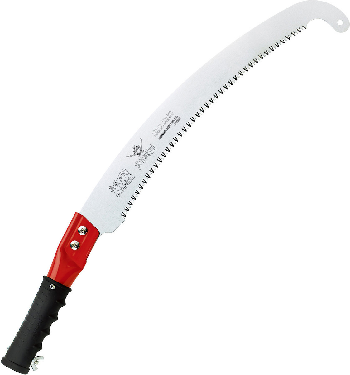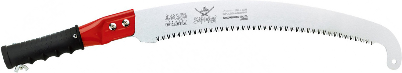 Χειροπρίονο – Κονταροπρίονο ιαπωνικής κατασκευής με κυρτή λάμα 35cm & γάντζο στο άκρο. Τα κυρτά χειροπρίονα SAMURAI διακρίνονται για την ειδική διάταξη των δοντιών τους, έτσι ώστε να διευκολύνεται ακόμα περισσότερο το κόψιμο και να μένουν όσο το δυνατόν λιγότερα υπολείμματα κοπής (πριονίδια) πάνω στα δόντια.Η ιαπωνική δύναμη: τα προϊόντα SAMURAI (KANZAWA) κατασκευάζονται στην Ιαπωνία από το εργοστάσιο Kanzawa Seiko,που εδρεύει στην πόλη Miki City, μια πόλη με τεράστια παράδοση στην κατασκευή λεπίδων, για περισσότερα από 100 χρόνια. Η SAMURAI (KANZAWA) έχει κύριο στόχο την παραγωγή και διάθεση τεχνολογικά προηγμένων προϊόντων υψηλών προδιαγραφών. Η εταιρία ξεχωρίζει για τις καινοτόμες λύσεις, όπως το μεταβαλλόμενου σχεδιασμού σύστημα τριπλής οδόντωσης (Διεθνές Δίπλωμα Ευρεσιτεχνίας), που επιτρέπει την εκτέλεση της ίδιας εργασίας με τη μισή δύναμη και στον μισό χρόνο απ’ ότι με τα συμβατικά πριόνια!