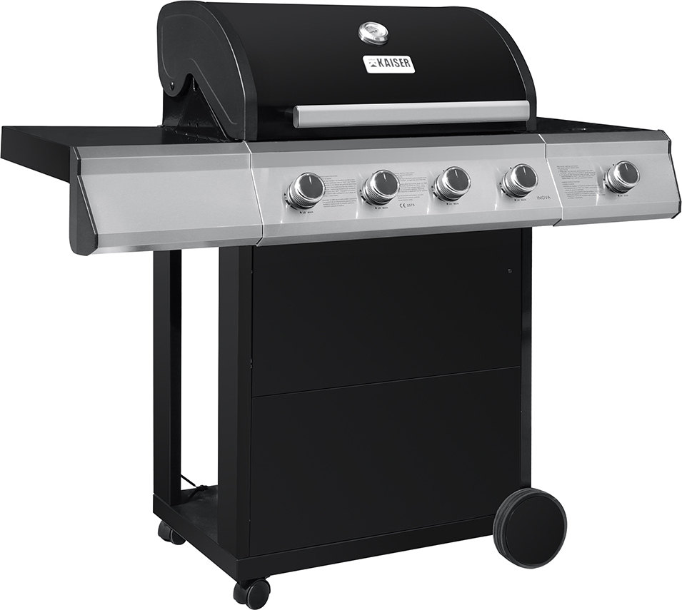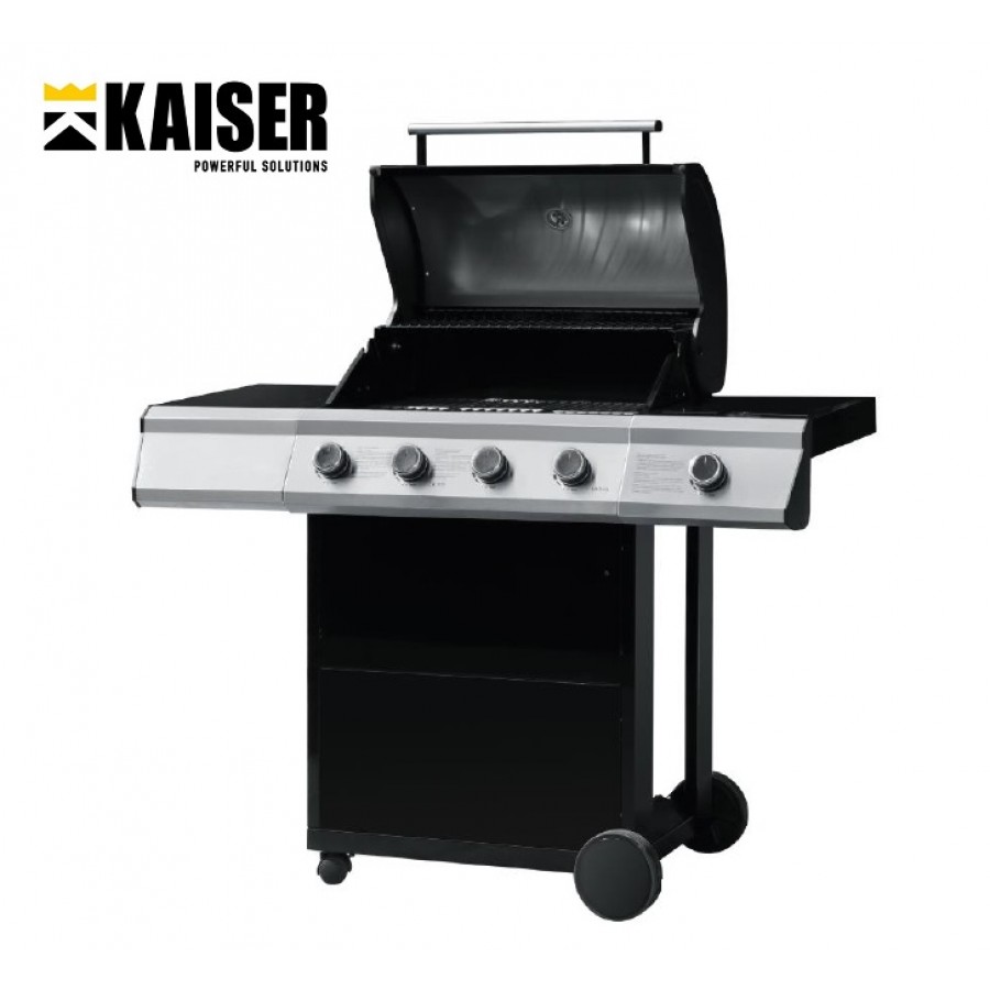 Ισχυρή ψησταριά Kaiser 4+1 καυστήρων (15 kW), με σχάρα από μαντέμι, πλαϊνή εστία, διπλό καπάκι και θερμόμετρο — ιδανική για απαιτητικά BB Qs.
