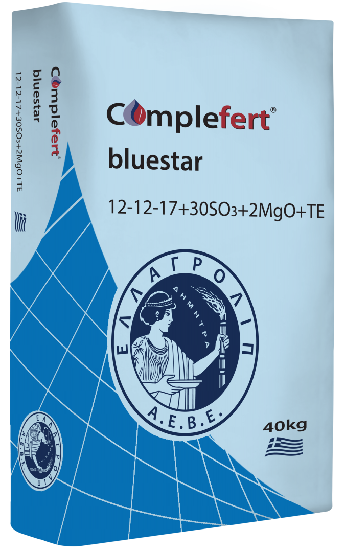 Σύνθετο ΝΡΚ λίπασμα με Μαγνήσιο και Ιχνοστοιχεία για όλες τις καλλιέργειες. Χαρακτηρίζεται από στοιχειακή πληρότητα, ομοιόμορφη κατανομή των μακρο και μικροθρεπτικών στοιχείων σε όλους τους κόκκους, μεγάλη υδατοδιαλυτότητα του Φωσφόρου και υψηλή περιεκτικότητα σε Κάλιο και Θείο. Η μελετημένη σύνθεση, η ειδική αναλογία και η υψηλή διαλυτότητα, αυξάνουν την απορρόφηση των θρεπτικών στοιχείων και καλύπτουν με ιδανικό τρόπο τις ανάγκες των φυτών, εξασφαλίζοντας ισόρροπη και αρμονική θρέψη στις καλλιέργειες που λιπαίνονται με αυτό.Στη βασική λίπανση το Complefert bluestar, εγγυάται την καλή εγκατάσταση και την εύρωστη ανάπτυξη των φυτών. Όταν χρησιμοποιείται επιφανειακά, σε μεταγενέστερα στάδια της ανάπτυξης, προωθεί την άνθιση, αυξάνει την καρπόδεση και βελτιώνει τα ποιοτικά χαρακτηριστικά της παραγωγής.Ιδανικό για τη βασική λίπανση όλων των καλλιεργειών (δενδροκομία, αμπελουργία, κηπευτικά) σε όλους τους τύπους των εδαφών.
