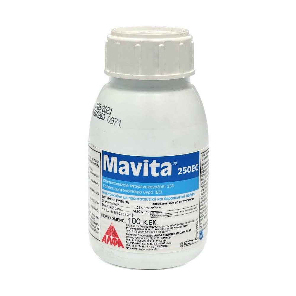 To MAVITA 250 EC είναι μυκητοκτόνο με προστατευτική και θεραπευτική δράση. Περιέχει τo δραστικό συστατικό difenoconazole (τριαζόλη) που κινείται διελασματικά. Καταπολεμά διάφορες μυκητολογικές ασθένειες σε μηλοειδή, πυρηνόκαρπα, ελιά, αμπέλι, λαχανικά, φράουλα, πατάτα, ζαχαρότευτλα, κρεμμύδι κ.α.