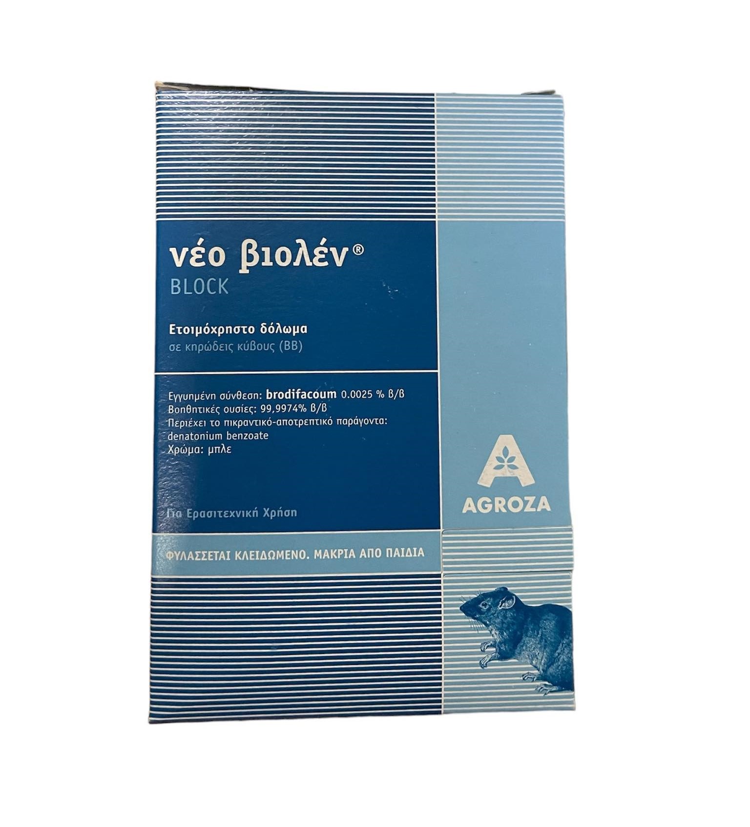Νέο Βιολέν Block Ποντικοφάρμακο 100gr, ετοιμόχρηστο, Δόλωμα σε κηρώδη τεμάχια (κύβος με τρύπα).Ισχυρό αντιπηκτικό τρωκτικοκτόνο 2ης γενιάς, που χρησιμοποιείται για την καταπολέμηση των ποντικών και των αρουραίων.