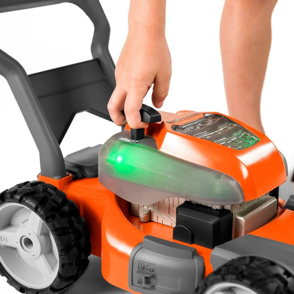 Παιδική χλοοκοπτική μηχανή μπαταρίας με ρεαλιστικό ήχο κινητήρα ο οποίος φωτίζεται καθώς τραβιέται το σχοινί εκκίνησης. Διαθέτει κουμπί ενεργοποίησης & απενεργοποίησης.