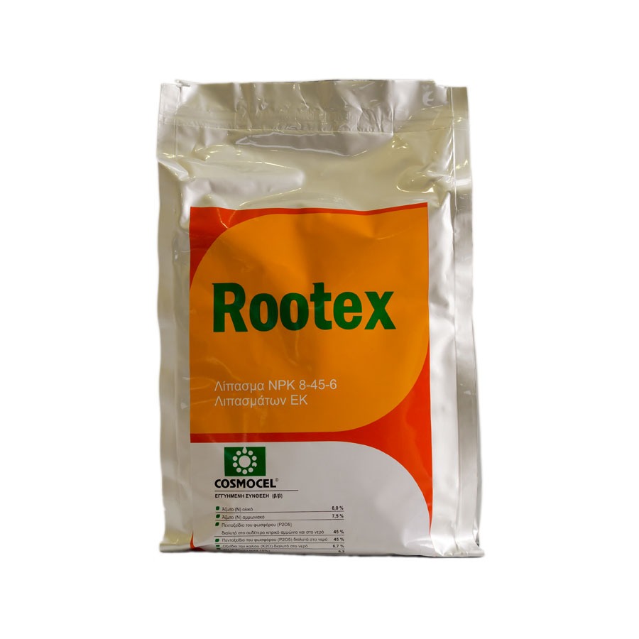 Το Λίπασμα Rootex 1kg είναι στοιχειακό φώσφορο προστατευμένο ώστε να μην δεσμεύεται στα κολλοειδή του εδάφους και στις ανθρακικές ρίζες, έτσι είναι όλο διαθέσιμο για το φυτό. Είναι ένας συνδυασμός οργανικών εκχυλισμάτων, φωσφόρου και καλίου με υψηλή ικανότητα αφομοίωσης.